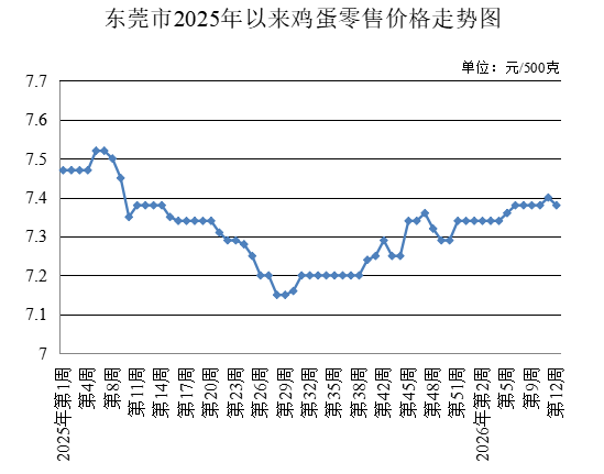 第12周,监测的鸡蛋农贸市场零售均价为每500克7.38元,较上周下降0.27%。